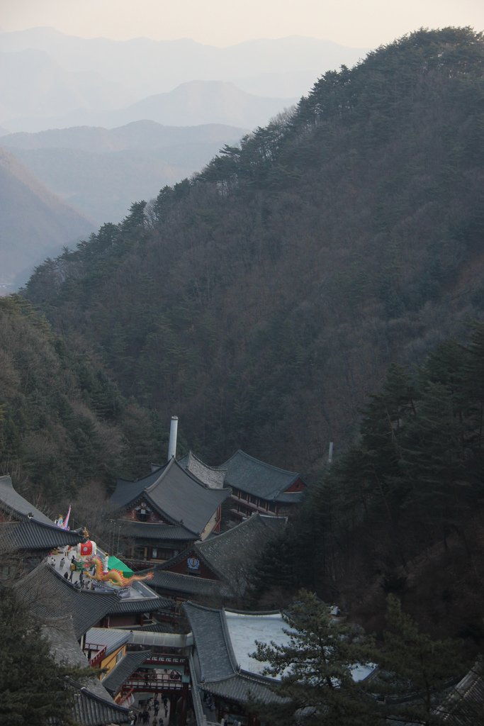 It’s no wonder why. That morning I’d trekked past the parka-clad ajummas huddling around the instant coffee vending machines and hordes of shoes respectfully removed at the door to each building, and reached the Great Teacher Hall, Guinsa’s modest peak. To look down at the Korean landscape for the first time from there, one would be convinced it’s nothing but mountains. The sound of monks’ praying, chanting, banging is inescapable—it echoes through the valley below, mingling with bird songs through unpolluted air against the early morning coral sky.