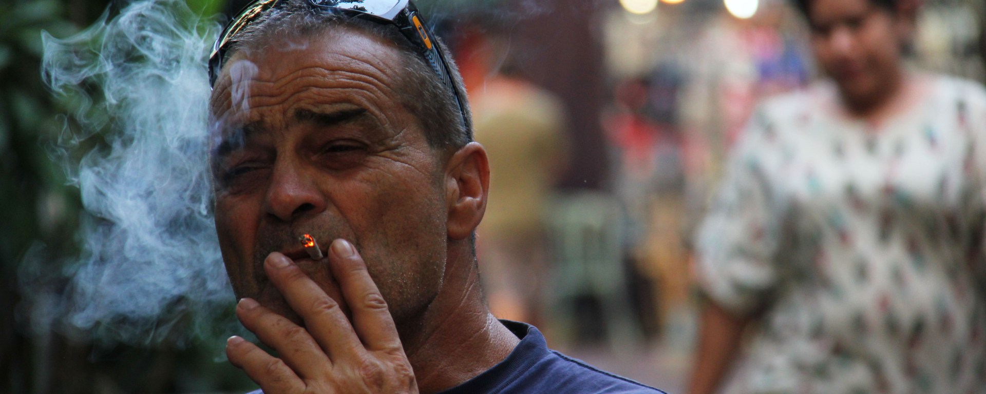 He changes his mind about the bracelet, but it is too late: He has made the mistake of not saying no, and now the woman won’t leave. She bides her time, standing still, raising trinket after trinket for him to reject. He lights a cigarette and fucks around with her, giving a listless thumbs up at everything, fueled by her attention. Their war of patience is a draw.