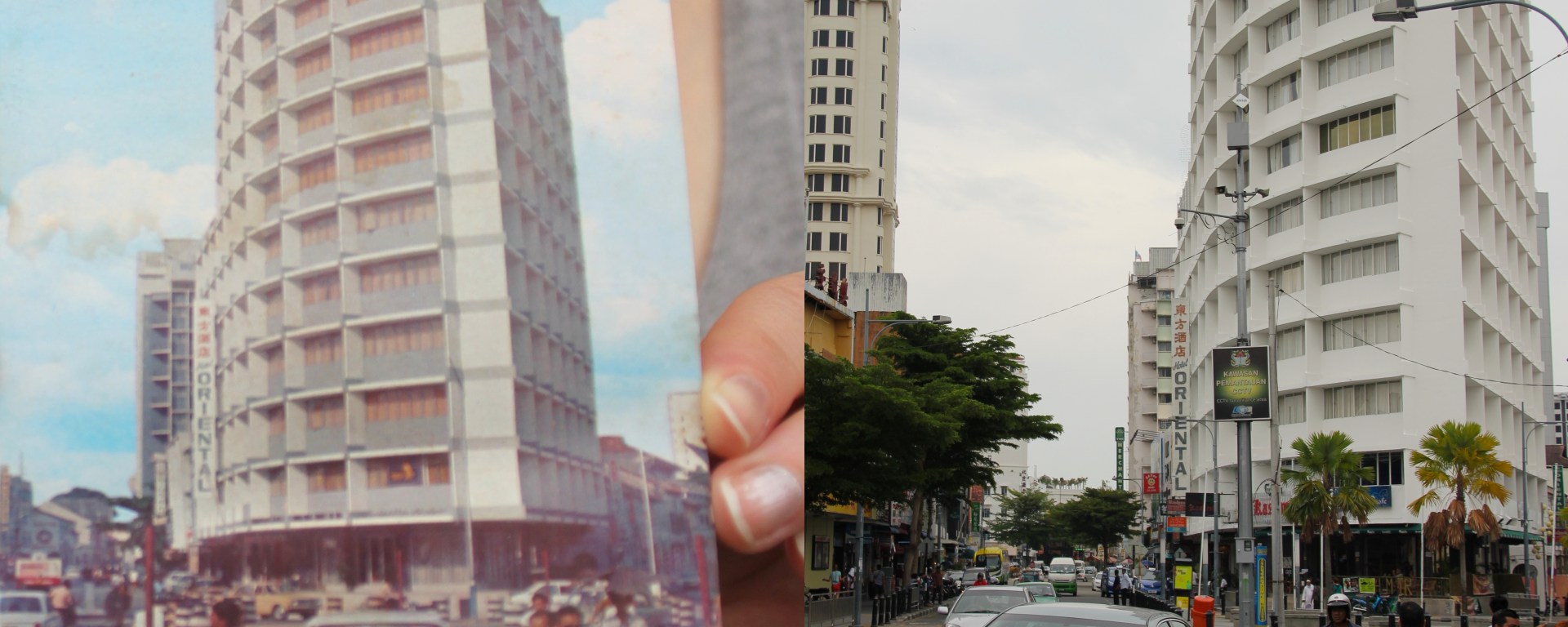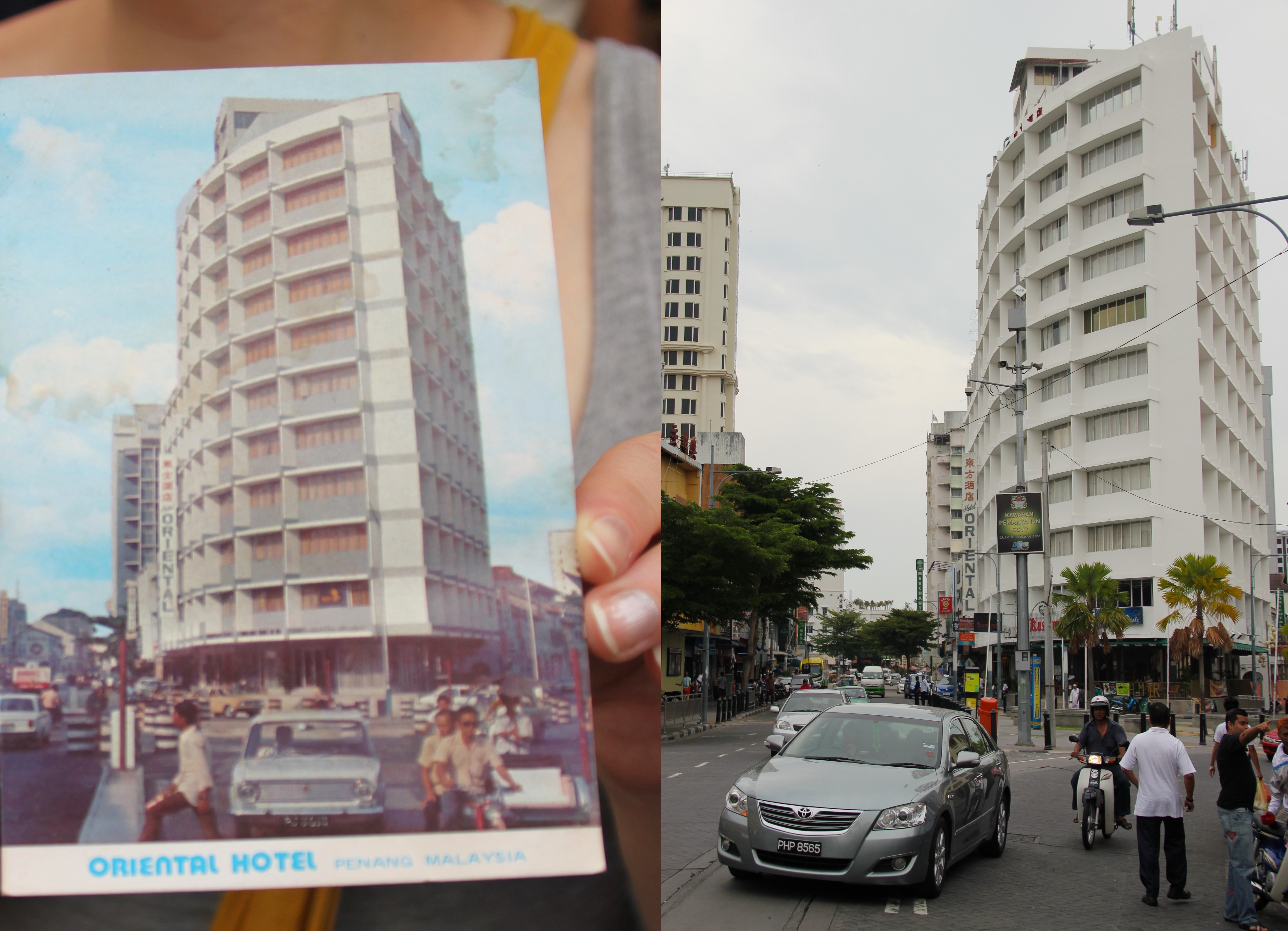 AN ISLAMIC NEIGHBOURHOOD was holding a garage sale in the middle of downtown George Town, Malaysia back in February. V and I spent close to 30 minutes rummaging through the stock, eventually leaving with just one item: a postcard of the very hotel we’d checked into the previous day, the Oriental. It was uncanny. I tried to take a replica shot, but the honking traffic of modernity made running in the middle of the street a challenge, and then it started to rain and I got angry and hungry, so the shot you see below is the best I could do.