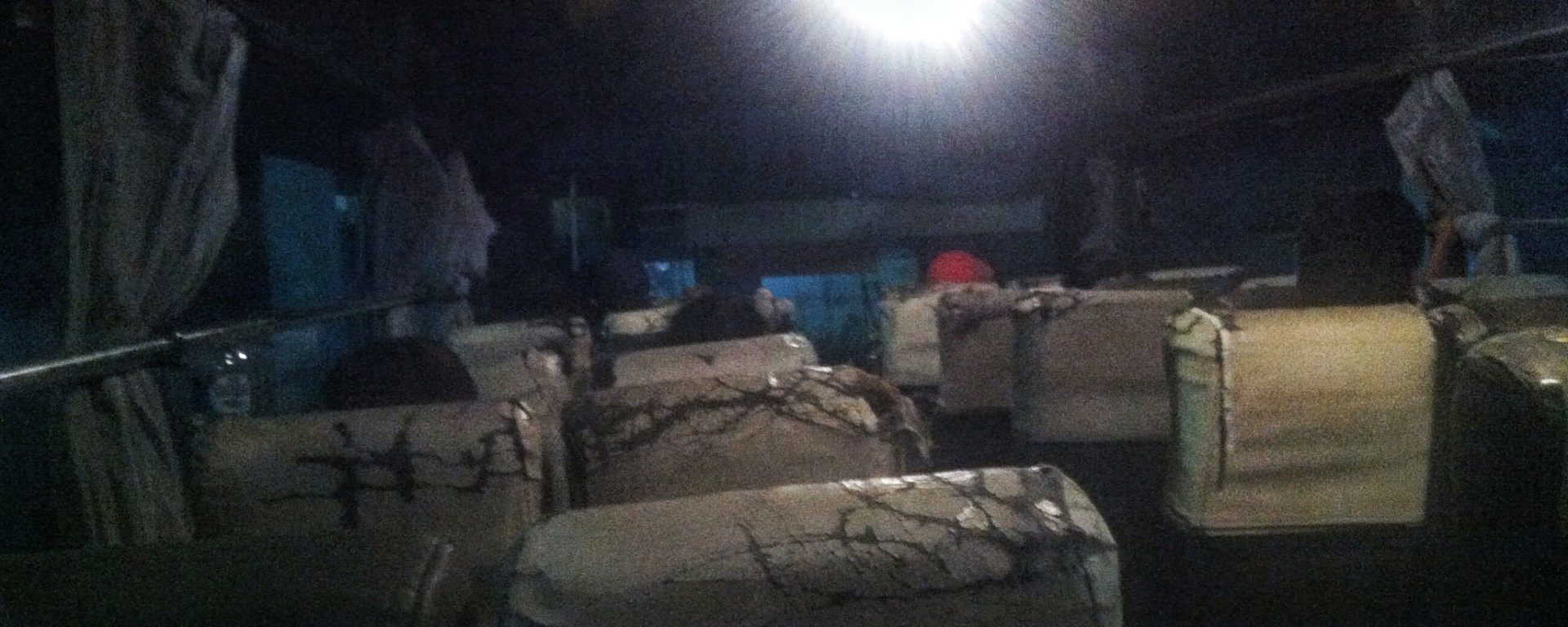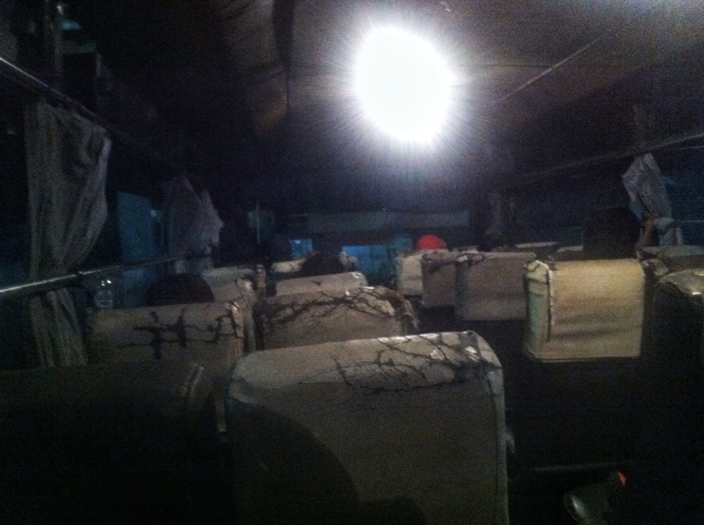 The white rubber seat covers were cracked like shattered ice. Overhead, three spare yellow bulbs — one of which only turned on intermittently — lit up what was otherwise a ride kept in darkness by the top windows painted black and shut. We pried some open at first, but the ticket boy — a lithe and handsome kid with the scrawny frame of an indie drummer and a pen tucked behind his puffy hair — closed them all, perhaps delusionally believing the bus to be air conditioned. Two broken blue water bottles dangled from the pipe nailed into the ceiling with no clear purpose. The floor was pure sheet metal.