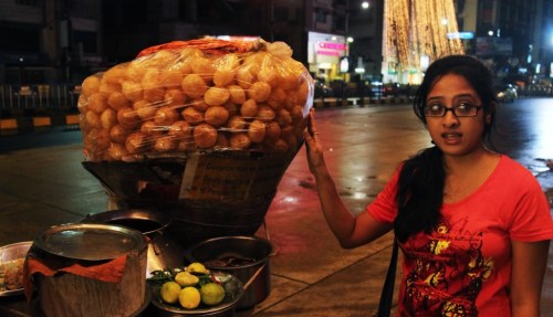 Our next stop, for a snack known only to locals and particularly daring travellers, was fuchka, a difficult one to swallow. The vendor grabbed two hollow crispy fried balls, popped holes in the tops with his thumbs, scooped a spicy potato mush in and dipped the whole thing into spiced tamarind water. We were expected to down the whole ball in a single go, but the combination of swallowing a fistful of probably dirty water and mashed potatoes would seem tricky even for the most experienced Indian glutton. We only ate a portion and moved on.