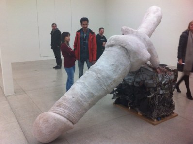 I was invited to the Viennese gallery opening of a famous modern English artist, Sarah Lucas. I could pick her out immediately from the crowd, made up mostly of Aryan-looking folk in Marino wool scarves, leather gloves and fine tweed jackets; she had stringy blonde hair, a British smile and a thick wool overcoat that hid her hands in the sleeves. She spent much of the night looking awkwardly at nothing, and disappeared early.
