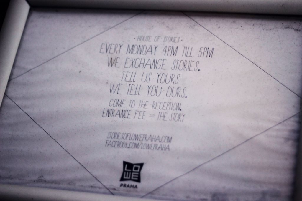“Every Monday we exchange stories,” the quiet sign read. “Tell us yours. We tell you ours.” I happened to be in Prague that Monday, so, curious, I walked in the quirky building and found a half-Kazakh, half-Korean girl asking the receptionist if anyone had inquired about her project yet. “Is is about the stories?” I asked. She looked amazed and relieved: “You have a story? Yes, please, come this way!”